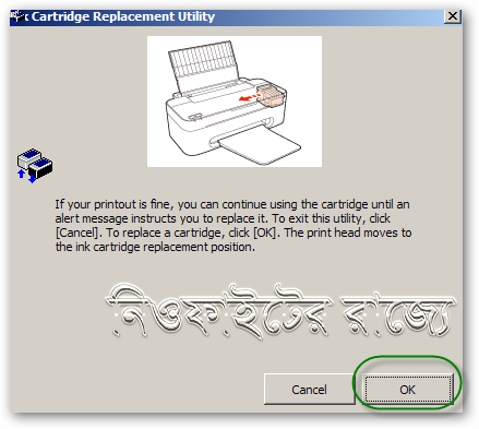 আপনার প্রিন্টারের মেইনটেনেন্স বাটনটি চেপে কার্ট্রিজের এমন অবস্থানে আনুন যাতে কার্ট্রিজের উপরের সুইচটি টিপ দেওয়া যায়। তারপর সুইচটি ৫-৬ সেকেন্ড টিপে ধরুন এবং আবার মেইনটেনেন্স বাটনটি চাপুন। তাহলে ইঙ্ক রিসেট হয়ে যাবে। এই পদ্ধতি উইন্ডোজ,লিনাক্স সব অপারেটিং সিস্টেমের জন্য প্রযোজ্য।